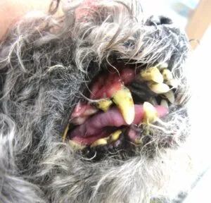 16歳メスのトイプードル。4カ月前に口を触るのを嫌がり、右上顎の先端に膨らみを認め、出血しているのに気付いたと来院しました。
